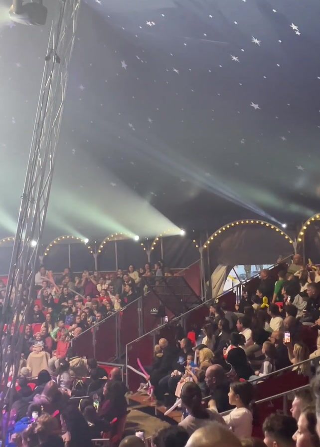 stunt performer on a dirt bike performing a jump inside a circus tent. The tent is dark with artificial stars on the ceiling. The performer rides up a steep metal ramp and jumps over a platform before landing on a large inflatable surface. The audience is visible in the background, seated in tiered rows, with many people holding up phones to record the performance. The words “ARENA CIRCUS SINCE 1953” are visible on the inflatable landing surface. There is stage lighting illuminating the performer and the landing area.