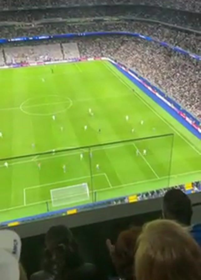 soccer game in progress from a high vantage point in a stadium filled with spectators. The stadium is brightly lit, with the green field visible below. Players in white and red uniforms are spread across the field, actively participating in the game. The video captures the action on the field with the camera positioned among spectators in the stands. Their heads and partial views are visible at the bottom of the frame, suggesting a subjective point of view.