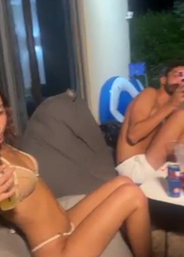 The video appears to show a group of young adults relaxing outside, possibly near a pool. A woman in a bikini is seated on a large gray cushion, drinking from a glass with a straw. A man, shirtless, is seen taking pictures with a phone. Another man sits at a table covered with cans and bottles. An inflatable pool toy is in the background. The camera moves around, focusing on different people in the group.