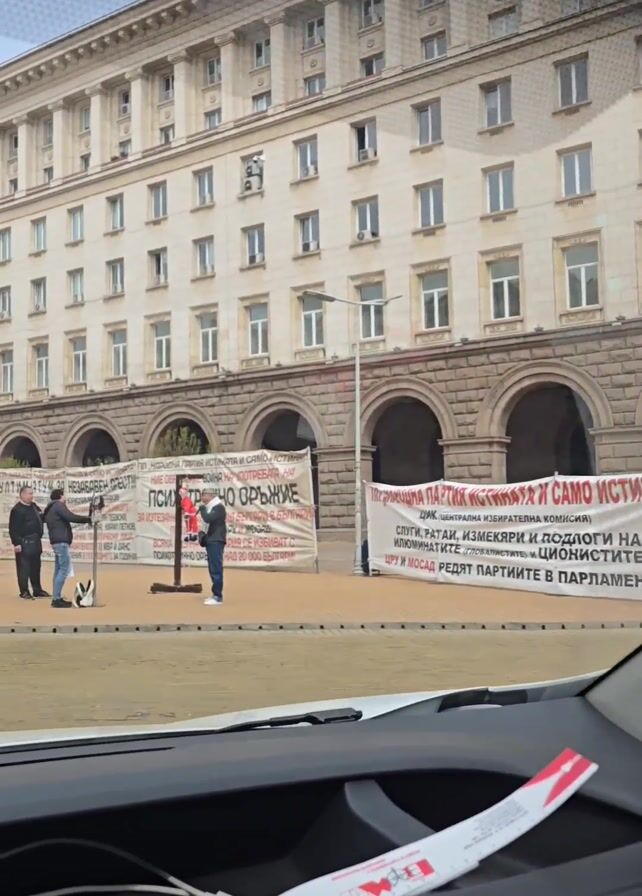 street scene in what appears to be Sofia, Bulgaria, from inside a car. There is a government building in the background, and in front of it, there are protest banners. The banners contain text in Bulgarian, with one saying "ЦЯЛТА ПАРТИЙНА И САМО ИСТИНАТА! СЛУГИ, РАТАИ, ИЗМЕКЯРИ И ПОДЛОГИ НА ЧУЖДИЯ ИНТЕРЕС! И НЕ ИСКАМ РЕДИТ ПАРТИИТЕ В ПАРЛАМЕНТА!". A dummy with red clothing is suspended on a wooden frame, meant to represent someone being hanged. Several people are standing near the protest display. The camera captures details of the scene, including the building's architecture, the protest banners, the dummy, and the reflections in the car's side mirror, which show more of the street.
