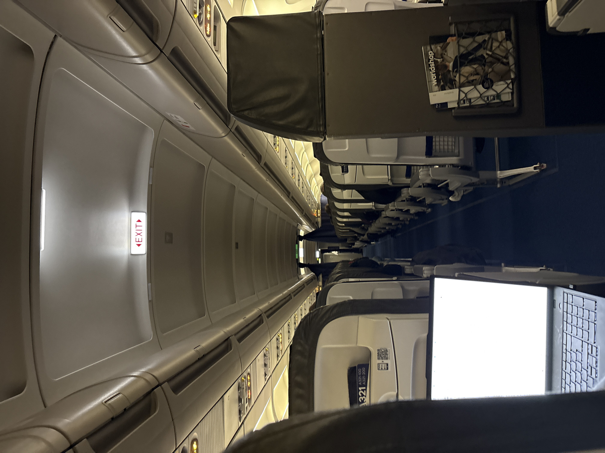 The image depicts the interior of an aircraft cabin, specifically an Airbus A321, viewed from a passenger's perspective looking forward down the central aisle. The location is inside an aircraft cabin, not a city. Rows of grey and white economy-class seats line both sides of the dark blue carpeted aisle. Overhead bins and passenger service units with individual lights are visible along the ceiling. A prominent, illuminated red and white "EXIT" sign is mounted on the overhead panel, with a green "EXIT" sign further down the aisle towards what appears to be a galley or bulkhead area, partially obscured by dark blue curtains. In the immediate foreground, a silver laptop with a brightly illuminated, blank white screen is open on a tray table to the left. To the right, the back of a seat features a mesh magazine holder containing a "worldshop" magazine. A seatback card on a forward seat indicates "A321-100 A321-200" and includes a QR code. The cabin appears sparsely occupied.