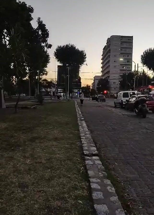street corner in a town with a park on one side and buildings across the street. A person is walking along the sidewalk next to the park. Cars and a motorcycle are visible on the street. The sky is light, suggesting dusk.