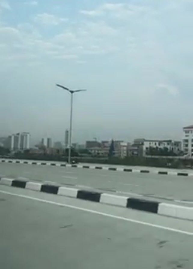 view from a moving vehicle, possibly a car, traveling on a road. The road is wide and appears to be recently constructed or well-maintained, with clearly marked lanes and a black and white curb. On the side of the road are tall street lights. In the distance, there is a cityscape with buildings of varying heights. The sky is light blue with scattered clouds, creating a slightly hazy or overcast atmosphere. A white van passes in the adjacent lane.