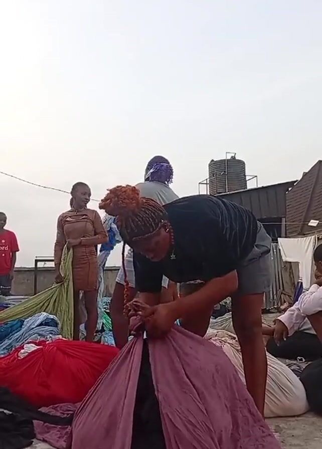 Several people are gathered on a rooftop, surrounded by large bags and piles of fabric. A woman with braided hair, wearing a black shirt and shorts, is working on closing a bag, pulling and tying a rope around the top. Other individuals stand or sit nearby, some holding or sorting through fabric. The rooftop setting is suggested by the presence of a water tank and other building structures in the background. The overall scene appears to be a work in progress, possibly related to sorting, packing, or preparing fabric.