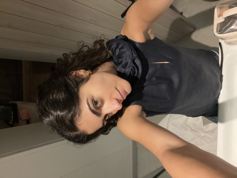 A young woman with dark curly hair and fair skin poses in a selfie. She wears a navy blue silk top with a small slit at the neckline. Her right arm is raised, drawing attention to her smooth skin. She has green eyes and a gold earring in her left ear. The background includes a white countertop, a makeup bag, and wooden paneling. The photo is slightly rotated, giving it a casual and off-center feel.