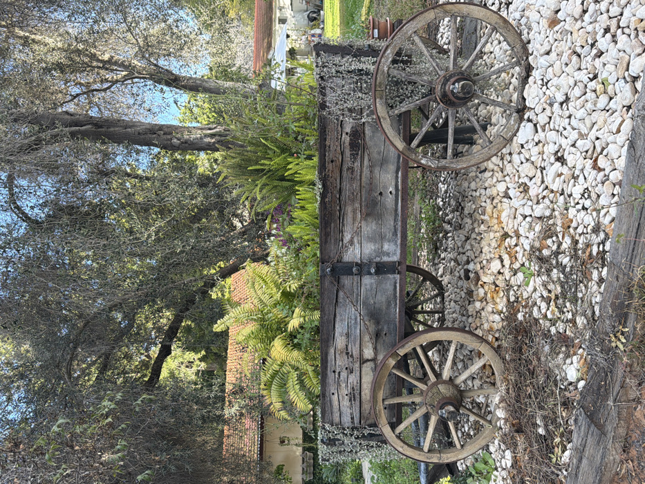 A wooden cart with two weathered wagon wheels sits on a bed of small white rocks. The cart is filled with green ferns and other plants. A large tree with bare branches overhangs the scene. A house with a red-tiled roof is partially visible in the background, adding depth to the scene.