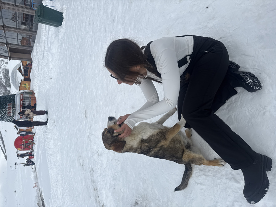 The image depicts a winter outdoor scene in Yeghipatrush, Armenia, covered extensively in snow. In the foreground, a female individual, likely in her 20s or 30s, is seated directly on the snow. She wears a white long-sleeve top, black ski overalls or wide-leg pants, and black platform boots with chunky soles. Her dark hair is pulled back, and she wears dark-framed glasses. She is actively interacting with a medium-sized dog with a mottled brown, white, and dark gray coat. The dog stands on its hind legs with its front paws resting near her lap, looking up at her. The woman's hands are placed around the dog's head and neck area, appearing to caress or hold it. The background reveals a snow-covered landscape with several structures. To the left and center, multiple small commercial kiosks or food stalls are visible, some with red and white branding including "PREPA" text. A large, green conical structure, possibly a decorative object or a large Christmas tree, stands prominently behind the kiosks. Several other individuals are visible in the mid-ground, walking or standing near these structures, dressed in winter clothing. To the far right, a large building with extensive glass windows and dark structural framing is partially visible. A bright green plastic wheeled trash bin is tilted and partially submerged in the snow on the right side of the frame. Snow-covered mountains or hills are present in the distant background under what appears to be an overcast sky.
