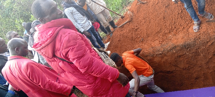 The image displays an outdoor scene in Namisha, Democratic Republic of the Congo, centered on an active excavation site. Approximately eight adult males are present. A large mound of reddish-brown soil dominates the right side of the frame, adjacent to a deep, rectangular pit. Within this pit, a man in an orange t-shirt and light-colored trousers is bent over, actively shoveling earth. Multiple long-handled digging tools are either in use or resting against the soil mound. On the top right, a person's lower legs and feet, clad in blue jeans and sandals, stand on the edge of the excavation. In the foreground to the left, a man in a bright red puffer jacket stands observing, with another man in a red long-sleeved shirt visible beside him. A distinct purple object, consistent with a casket lid, is partially visible at the bottom right. The background to the far left exhibits dense green vegetation.