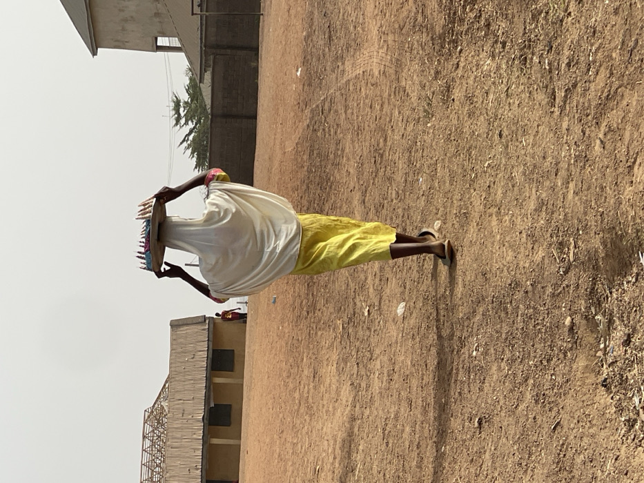 A woman in yellow pants and a white head covering carries a tray of items on her head in an outdoor, dirt-covered area. She supports the tray with her hands, balancing it as she walks. In the background, there are buildings, and some trees in the distance under a hazy sky. A building under construction is on the left.