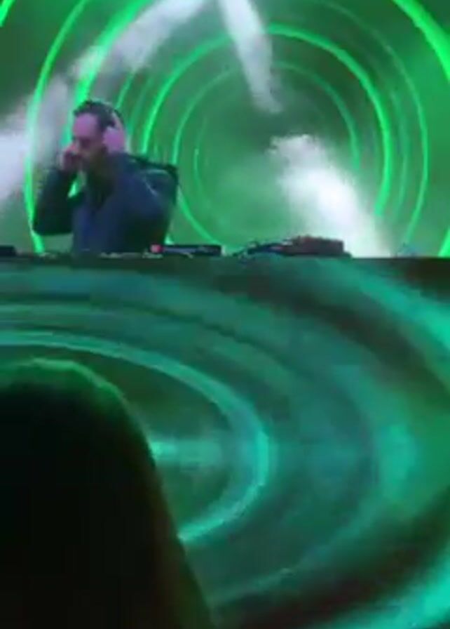 A man is DJing in front of a large screen with green circular graphics. He adjusts his headphones. Someone with long green hair is in the foreground.