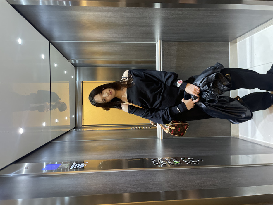 - "Within an elevator in the city of Cachan, France, a young adult female with long dark hair stands centrally, facing the camera with a neutral expression" by FM-LkssQ2, licensed under CC BY 4.0
