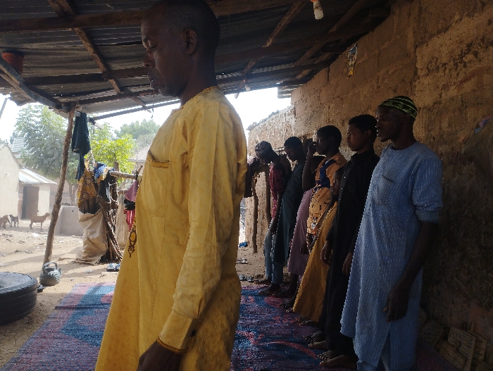 This image captures a semi-covered outdoor area in Pantame, Nigeria. Seven individuals stand aligned on patterned mats beneath a corrugated metal roof supported by wooden beams. In the foreground, an adult male with a trimmed beard wears a long-sleeved yellow garment, standing in profile facing right. Behind and to his right, six additional individuals, predominantly male, stand barefoot in a line, also facing right, on blue and red patterned mats. Their attire includes dark long-sleeved garments, a light-colored top with a long skirt, and a light blue patterned tunic with a green-striped kufi cap. The structure features a rough, light brown mud-brick wall on the right. The ground is dry and dusty, with a dark tire and a dark, heavy object (possibly a kettlebell) visible in the left foreground. Clothes hang on a line or pole further back on the left. In the distant background, small residential buildings and sparse trees are visible, along with three goats. A single light bulb hangs from the roof structure. Small, rectangular objects lean against the mud wall on the far right, near the feet of the standing individuals.