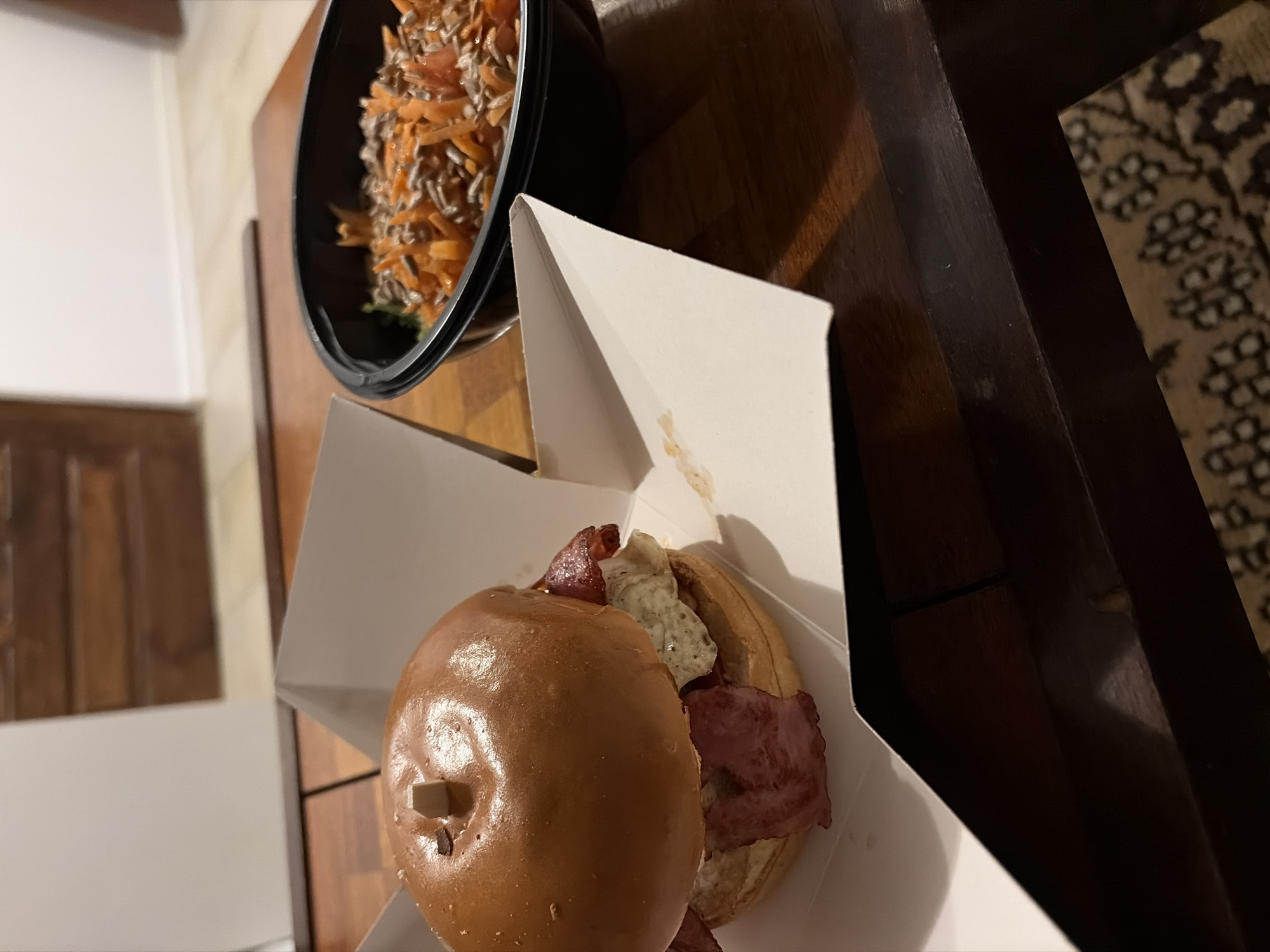 The image displays two prepared food items positioned on a dark, polished wooden table, indoors in Varna, Bulgaria. On the left, a burger is contained within an open, white cardboard delivery box. The burger consists of a glossy, light brown bun, a white patty or sauce layer, and multiple strips of cooked bacon protruding from its sides. A short, light-colored stick or skewer is inserted vertically through the center of the top bun. To the right, a black, round plastic bowl holds a salad containing shredded orange carrots, green leafy elements, and a visible topping of assorted seeds, including ovate and elongated varieties. The immediate background shows a light-colored wall, with out-of-focus dark wooden structures, possibly doors or furniture, visible further back. A segment of a patterned rug with light and dark motifs is discernible on the floor beneath the table on the lower right. The scene is devoid of individuals.