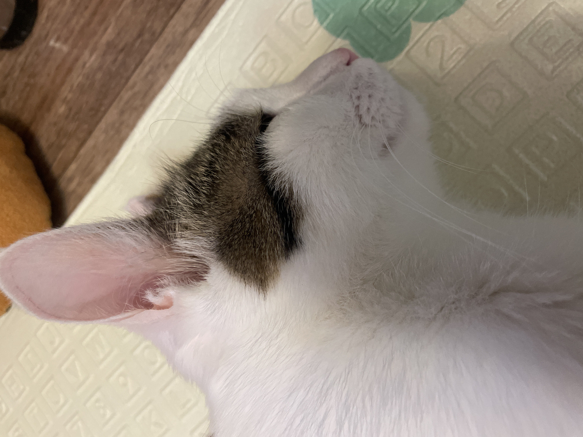 A domestic cat is observed resting on a light yellow, textured foam mat in a room located in Подстёпки, Russia. The cat, oriented with its right side presented to the viewer, displays predominantly white fur. Distinct brown and tabby-patterned fur is present on its forehead and extends partially over its right eye and ear. The inner surface of its right ear is pink. The cat's eyes are closed or nearly closed, and a light pink nose is visible. Multiple long, white whiskers extend from its muzzle area. The foam mat exhibits a repetitive raised pattern, including geometric shapes and what appear to be embossed numbers such as '2' and '3'. In the background, a brown wooden floor with visible plank lines is present, along with a blurry orange object and a dark, indistinct object. A textured green object is partially visible on the mat near the cat's nose.
