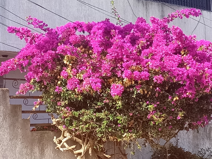 A vibrant bougainvillea bush bursts with bright pink flowers. Its thick, tangled branches rise from a gnarled base, extending across a weathered stone wall. Green foliage peeks through the dense blooms, suggesting a healthy undergrowth. A pale grey wall with visible wiring serves as the backdrop, providing a muted contrast to the flower's boldness. The scene is bathed in sunlight, highlighting the plant's textures.
