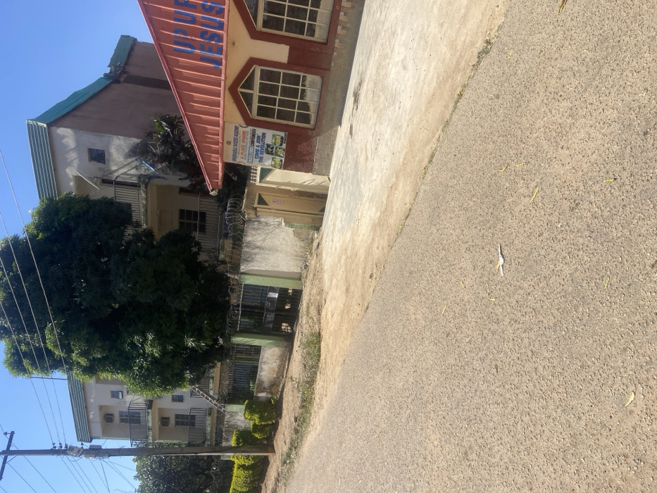The image depicts a street scene in Jos, Nigeria, under bright daylight. In the foreground, an asphalt road with visible aggregate texture shows light wear and scattered dry leaf debris, along with a single white, irregularly shaped object near its center. To the right of the road, a single-story building with a reddish-orange corrugated metal roof is visible. The words "UP JESUS" are prominently displayed in white letters on its facade, which is predominantly dark red below the roofline and cream-colored further down. A sign affixed to this building reads "OVERBAKLI SUCCESS ACADEMY - A PLACE WHERE KNOWLEDGE IS POWER COME & JOIN THE REVOLUTION." The building features two arched windows with multiple panes. A light-colored concrete path extends from this building towards the asphalt road. Behind and to the left of the single-story building, a multi-story structure (at least three floors visible) with cream-colored walls, dark green balcony railings, and a green-tiled roof is present. A large, mature tree with dense green foliage partially obscures the upper floors of this building. A perimeter wall, primarily concrete with green accents, separates this property from the road. The wall is topped with razor wire or barbed wire and features a black metal gate with green vertical bars. A smaller, light-colored gate is situated to the right of the main black gate, closer to the academy building. Green, manicured bushes line the interior side of the wall. On the far left, a utility pole with multiple overhead power lines is visible against a clear blue sky.