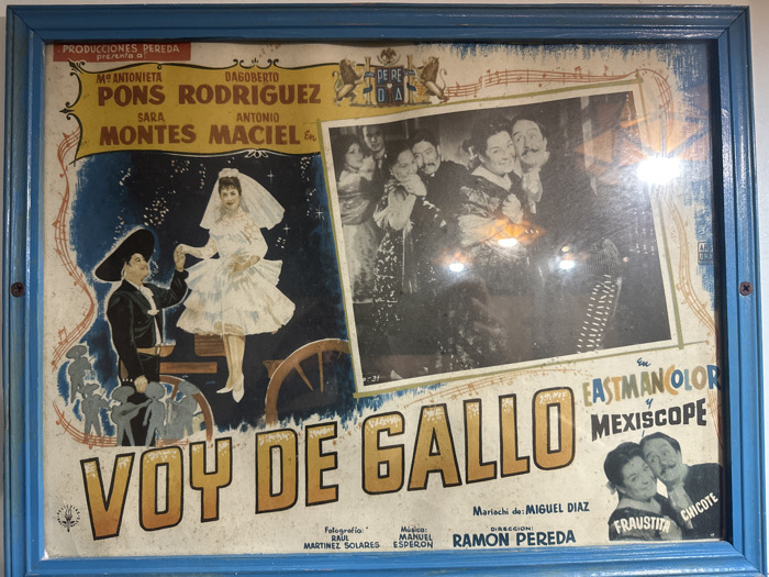 The image displays a framed, vintage Mexican movie poster titled "VOY DE GALLO" (I Go Courting), mounted on an interior wall