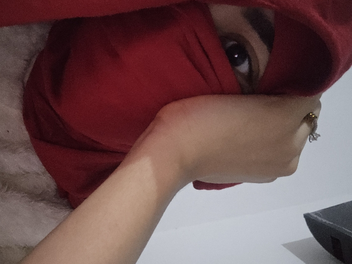 A person with dark hair and an eye peeks out from under a red hood or scarf. The fabric covers most of their face. Their hand, adorned with a ring, is raised to their face. Fluffy white material lines the inside of the hood. The background is a plain white or off-white color, with a black object visible in the lower right corner. The image is lit from above and is oriented upside down.