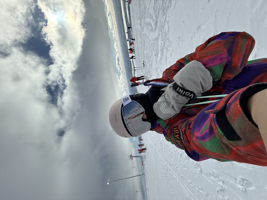 A person is depicted in a selfie on a snow-covered ski slope at a ski resort in Kirovsk, Russia