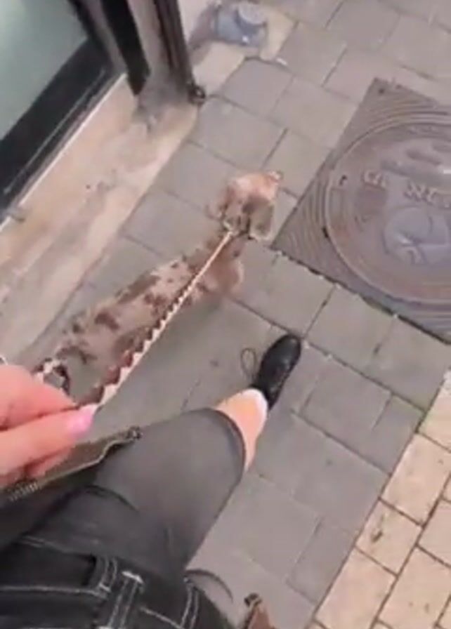 A person wearing black boots and short denim pants walks a dachshund on a leash across a gray-tiled sidewalk. The dog has a mottled pattern in light brown and beige. The sidewalk has patches of greenery and a green metal chair. The video is taken from the first-person perspective of the person walking the dog.