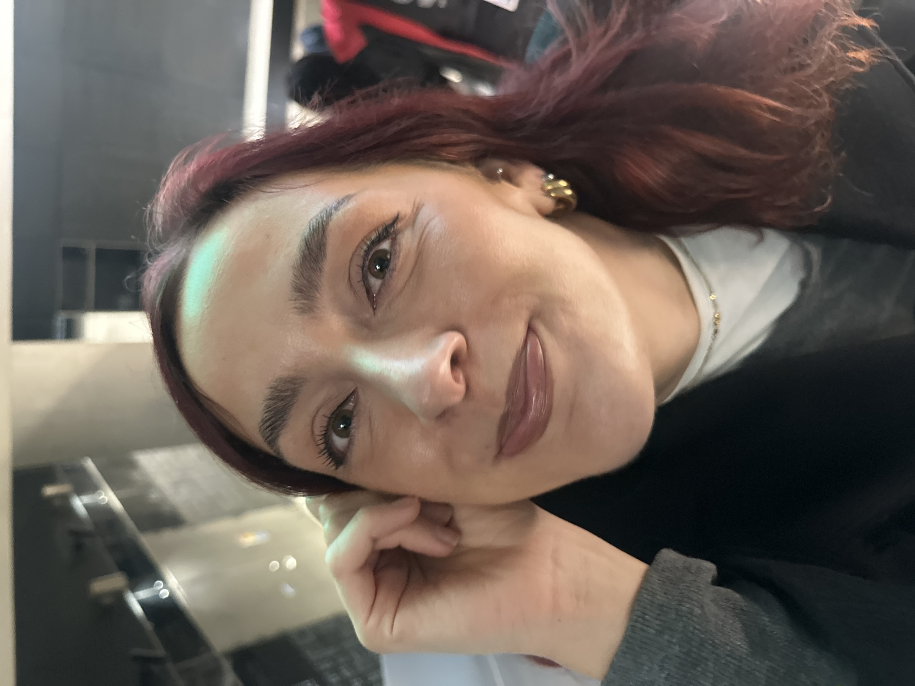A woman with auburn hair is shown close-up, looking at the camera with a slight smile. She has fair skin, defined eyebrows, and noticeable eyelashes enhanced with mascara. Her lips are coated with a glossy lipstick. She wears a chunky gold earring in her right ear. Her left hand is raised near her face, resting on her wrist. A white top is partially visible under a black jacket. The background includes a blurred mix of light and dark shades.