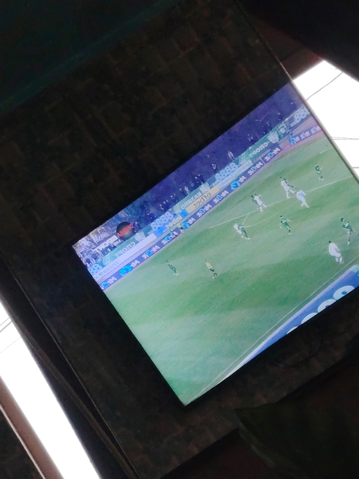 - "An indoor scene in Aytos, Bulgaria, captured from an oblique, tilted angle, features a large television screen displaying a football (soccer) match" by FM-6TLuq1, licensed under CC BY 4.0