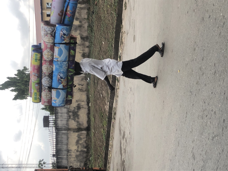 The image displays a forensic scene from Owerri, Nigeria, showing a male individual walking from left to right on a grey asphalt road. The individual is attired in a light-colored short-sleeved shirt, dark trousers, and dark open-toed sandals. He is carrying a substantial stack of approximately 14-16 rolled-up mats or thin mattresses balanced on his head, secured with dark straps. The mats exhibit various colorful patterns, including floral, geometric, and cartoon-like designs, such as blue mats featuring fish or mermaids. In the immediate foreground, the asphalt road surface shows minor wear and discoloration. A small circular yellow object, possibly debris, lies on the road near the bottom center. To the left of the road, a narrow dirt shoulder separates it from a low, weathered concrete wall, approximately 1.5 meters high, displaying patches of dirt and discoloration. This wall is topped by a dark metal spiked fence. Behind the fence, a dark, elevated water tank is visible on a stand, and a tall metal lattice tower is present on the far left. Sparse vegetation grows along the dirt shoulder and behind the wall. In the midground, a dense cluster of green trees rises above the structures, and partially obscured light-colored buildings with dark roofs are visible further to the right. The sky overhead is uniformly overcast.