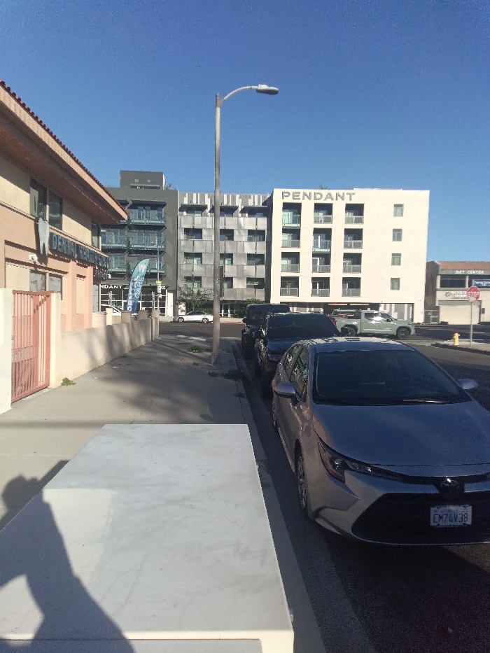 The image captures an urban street scene in downtown Los Angeles, California, specifically facing southeast on South Hope Street. The foreground features the flat, light-colored surface of a rectangular object, possibly a concrete planter or bench, displaying the distinct shadow of an unseen photographer or object. To the left, a two-story building with a tan facade and a red-tiled roof overhang is visible. A large white, vertical tooth-shaped sign is affixed to its exterior, with partially visible text below reading "OSHAWA DENTAL CARE." A light-brown metal fence delineates the property line along the concrete sidewalk. Parallel to the sidewalk on the right, a street is occupied by parked vehicles. The closest vehicle is a silver/light grey Toyota sedan, likely a Corolla, parked curbside and facing away from the viewer. Its California license plate, EM74V38, is clearly visible. Behind it, at least two dark-colored sport utility vehicles (SUVs) are also parked. The background is dominated by multiple modern multi-story buildings under a clear blue sky. A prominent cream-colored building features the word "PENDANT" on its upper facade, identified as The Pendant Residences. It exhibits multiple balconies with glass railings. To its left, a darker grey modern building with similar balconies stands, with a blue banner displaying "DENTAL CARE" at its street level. Further left, another multi-story building with a grey, grid-patterned facade is visible. On the far right, beyond the "PENDANT" building, a single-story commercial building displays "DIET CENTER" signage. A red stop sign and a yellow fire hydrant are visible near this building. A tall, grey streetlamp with a modern fixture is centrally positioned on the sidewalk, casting a shadow to the right.