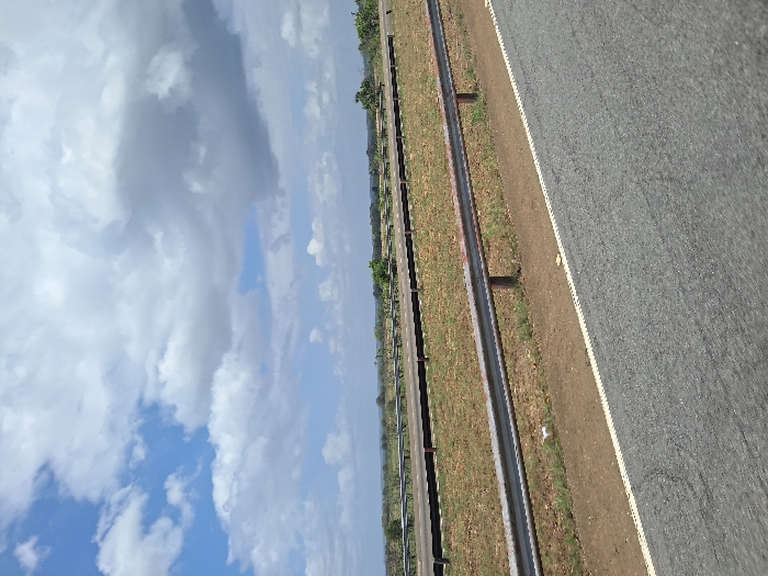 The scene shows an outdoor view of an asphalt road under a sky with clouds. A stretch of greenery and trees runs parallel to the road. A metal guardrail separates the road from the green area. The road surface appears slightly rough, and a painted line marks its edge. The perspective of the image gives a sense of movement along the road.