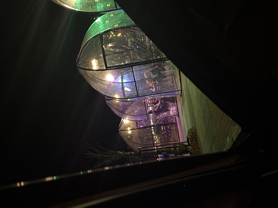 At night, a stack of transparent, dome-shaped structures are illuminated with colored lights. Inside, blurred figures suggest occupants dining or gathering. The enclosures appear to be connected to a textured wall. The image is partially obstructed by a car window frame and a dark interior, offering a skewed perspective of the scene.