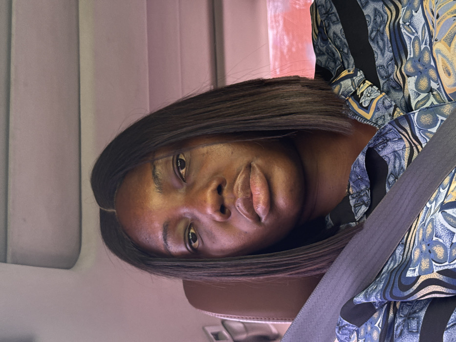 An adult female is depicted seated within the passenger compartment of a vehicle. She has dark skin and straight, dark, shoulder-length hair with a central parting. She wears a multi-patterned shirt in tones of blue, black, and beige, and a dark grey seatbelt is secured across her chest and left shoulder. Her gaze is directed towards the camera. The vehicle interior shows a brown leather seat or headrest to her left and a light-colored headliner above. A reddish ambient light is visible through a window on the right side of the frame, suggesting an external view or lighting condition. The image provides no specific visual cues to identify a precise location within Abuja, Nigeria.