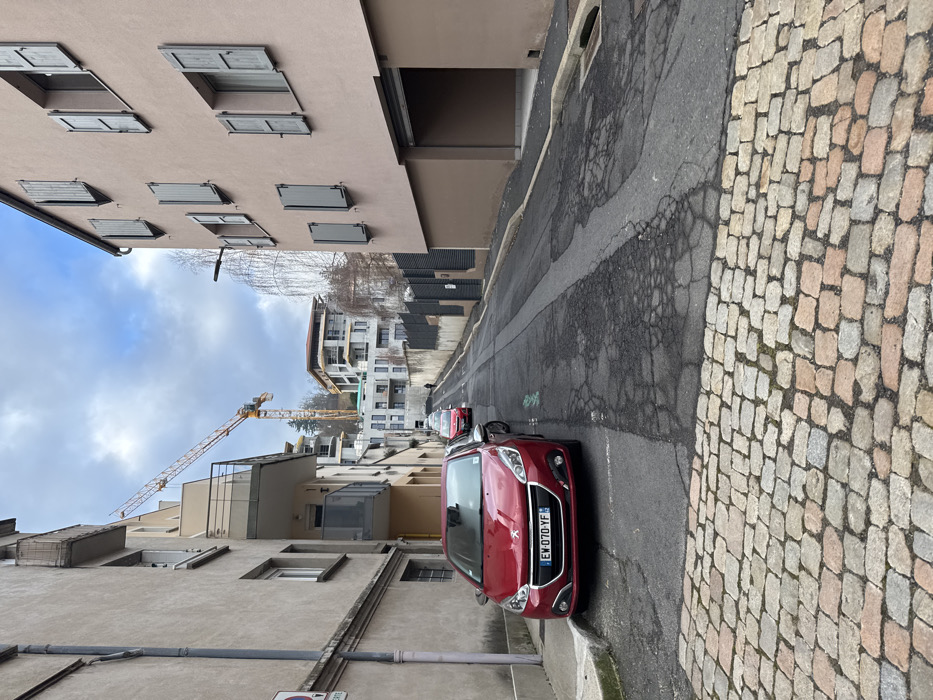 This image depicts an upward-sloping urban street in Le Puy-en-Velay, France, observed under an overcast sky. The foreground road surface consists of multi-toned cobblestones, transitioning to cracked and patched asphalt. A red Peugeot 208, bearing French license plate EW-070-YF, is parked on the left, partially on the raised curb. A second, darker vehicle is parked immediately behind it, followed by another red vehicle further uphill. The left side of the street is defined by a multi-story light beige building featuring balconies with dark railings and multiple windows; a red circular "No Parking" sign with a diagonal line is affixed to a pole near this building. The right side features a multi-story light peach-colored building with a dark brown lower facade, containing multiple windows fitted with closed grey shutters and a dark, recessed garage entrance. A dark street light fixture extends from this building's facade. In the background, the street ascends towards a hillside occupied by several modern multi-story buildings, some appearing to be under construction, characterized by concrete frames and multiple balconies. A tall yellow tower crane is prominently visible above these structures, indicating active development. Bare trees are dispersed across the hillside. A solitary, dark-clad individual is discernible walking uphill on the far left side of the road.