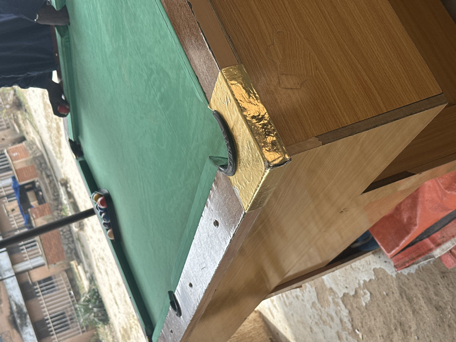 The image presents an outdoor scene in Tudun Nupawa, Nigeria, featuring a pool table from a low-angle perspective