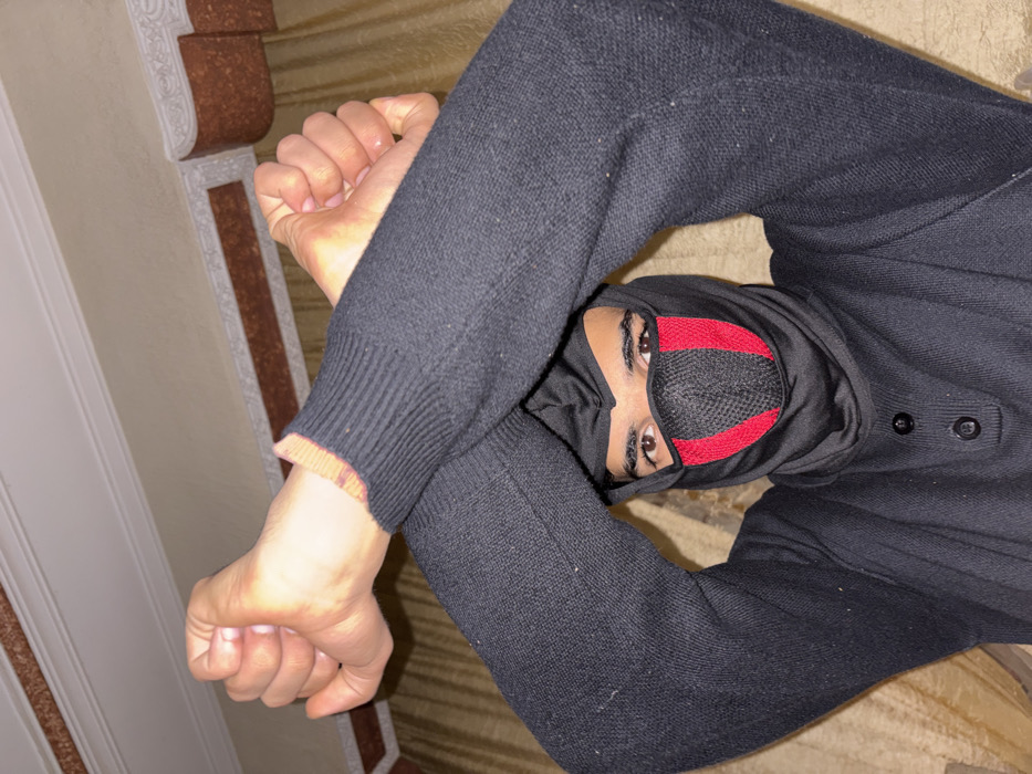 A male individual is depicted indoors in Fez, Morocco, facing the camera directly. He is wearing a black knitted sweater with a three-button placket at the collar and a black balaclava-style mask. The mask covers his head, neck, and lower face, featuring a central vertical red stripe flanked by black mesh panels over the nose and mouth area. His brown eyes are visible through the mask's eye openings. Both arms are crossed above his head, forming an 'X' shape, with hands clenched into fists. The cuffs of his sweater are ribbed, and a reddish-orange lining is visible on the inner edge of his right sleeve cuff. The background consists of a light-colored wall with elaborate white crown molding. Below the molding, a decorative horizontal band incorporates a reddish-brown, possibly textured, material. A gold-colored curtain or drapery is partially visible on the right side of the frame.