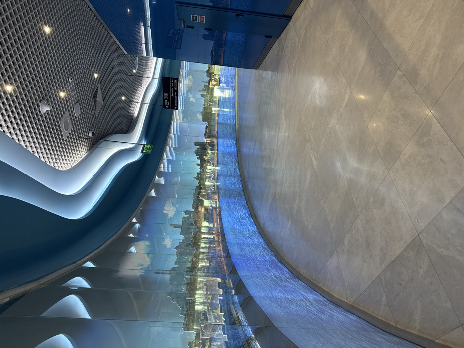 The image displays a brightly lit, modern interior architectural space, likely a concourse or passageway, located in Şişli, Turkey. No individuals are present in the scene. A prominent curved wall on the left features a large, multi-panel LED display. The upper section of this display presents a detailed cityscape, possibly Istanbul, under a blue sky with scattered clouds. The lower section of the display animates a vibrant blue body of water with dynamic ripple effects, creating a continuous visual horizon. Above the LED display, the curved wall transitions into smooth, wavy light blue panels illuminated by integrated cove lighting emitting a cool white-blue glow. A green "EXIT" sign with a white running man pictogram is affixed to this upper section of the wall. The ceiling above is a light grey grid-patterned system, equipped with recessed circular light fixtures, speakers, and a small, dark security camera. A black directional sign hangs from the ceiling, displaying white Turkish and English text: "Çıkış / Exit" and "Asansör / Lift" with corresponding arrows, followed by "1-2-3-4-5-6-7-8" beneath "Lift." The right side of the space features a straight, glossy, deep blue wall with a reflective surface. This wall contains at least two flush-mounted blue doors, each fitted with a black horizontal handle and minor, unreadable white and red signage. The floor throughout the area consists of light grey square tiles, which are clean, reflective, and show subtle illumination patterns from the overhead and wall lighting. No other objects or actions are depicted.