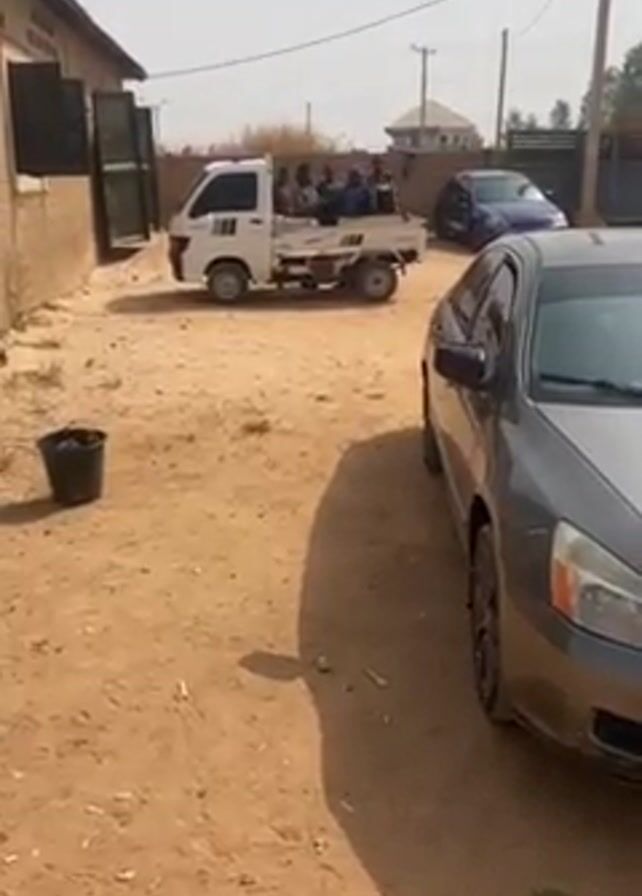 dirt yard with several parked cars, a building, and a small white truck carrying several people in the back