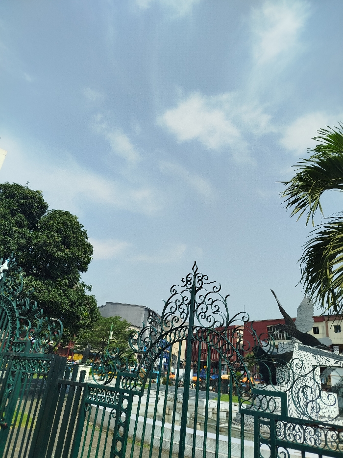 The image captures an exterior view looking into Freedom Park in Lagos Island, Lagos, Nigeria, under a partly cloudy, light blue sky. In the immediate foreground, a dark green, ornate wrought-iron gate and fence, featuring scrollwork and vertical bars, is partially open on the left. Beyond the fence, on the right, stands a prominent white and black sculpture resembling a large bird, possibly an eagle, with upward-sweeping wings, positioned on a patterned base. To the left, dense green foliage from mature trees dominates the mid-ground. Further back, various urban buildings are visible, including a multi-story structure with a grey roof and a distinct red-orange building. No specific individuals or discernible activities are evident.
