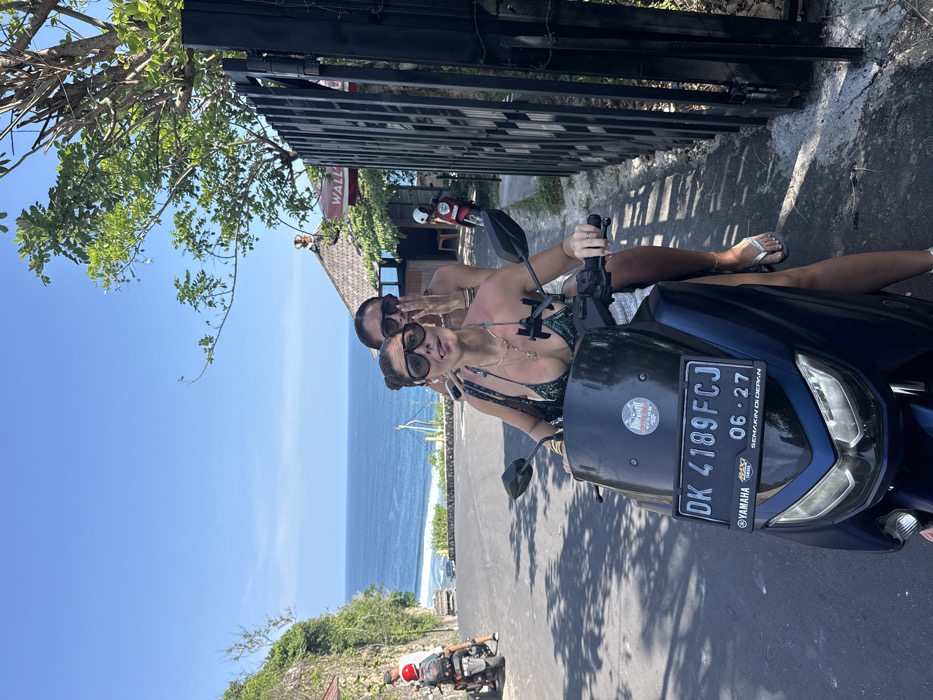 Two females are depicted on a dark blue Yamaha NMAX scooter, license plate DK 4189 FCJ 06-27, on an asphalt road in Ungasan, Bali, Indonesia