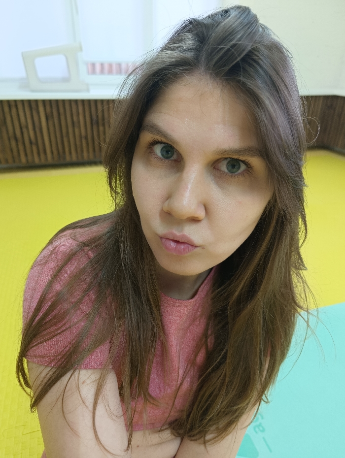 A woman with fair skin and long brown hair poses for a selfie. She wears a pink t-shirt and has light green eyes. Her lips are pursed in a subtle pout. The background features a yellow floor, a brown wooden wall, and a white object on a shelf near a window. There is also a green surface visible in the lower right corner. The lighting is bright and evenly distributed.