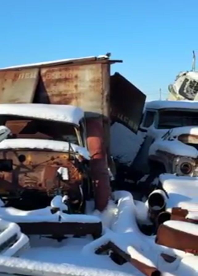 snow-covered junkyard under a clear blue sky