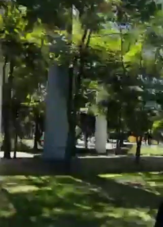 scene of a park or landscaped area viewed from inside a moving vehicle. The camera moves past trees, a grassy area, and white lampposts. The sky is visible in the background and appears clear. The sun is shining brightly, creating strong light and shadows.