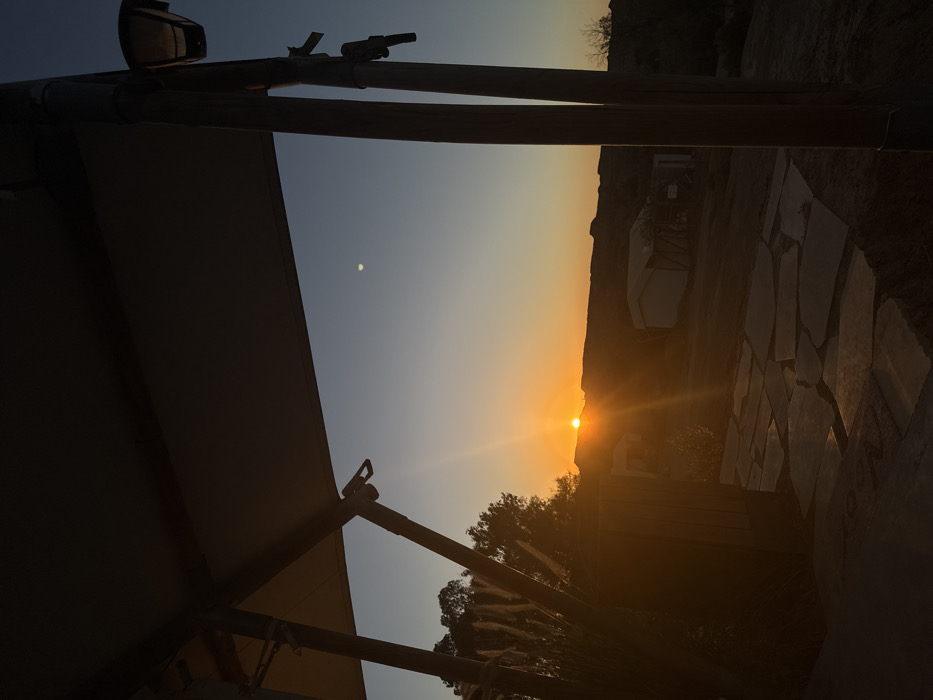 The image depicts an outdoor landscape scene during either sunrise or sunset in the Merhavim Regional Council, Israel. The foreground is dominated by the dark silhouette of a structural overhang, likely part of an awning or canopy, supported by two vertical poles visible on the left and right. A light fixture is attached to the rightmost pole. Below the overhang, on the ground, an irregular stone slab pathway or patio is visible. To the left, a cluster of tall, feathery grasses or similar vegetation stands, backlit by the sun. The midground features an arid, undulating terrain with sparse vegetation and at least two small, light-colored structures, possibly tents or cabins. In the background, low-lying hills or mountains are silhouetted against the horizon. The sun is a prominent, intense orange orb positioned just above these distant hills, casting strong rays across the scene. The sky transitions from a brilliant orange and yellow at the horizon to a clear, deep blue at the top. A distinct, small, bright off-white celestial body, possibly the Moon or a planet, is visible in the upper-right portion of the blue sky. There are no people present, and no active interactions or specific actions are depicted.