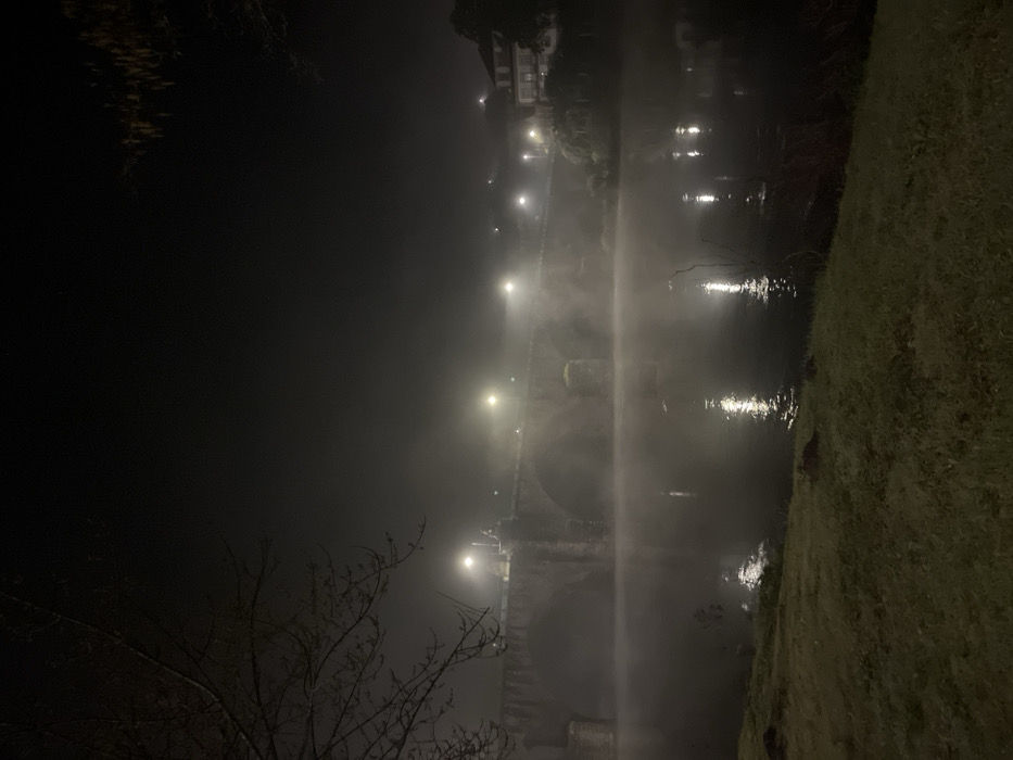 A nighttime view shows a foggy river with reflections of lights. A stone bridge, illuminated by lamps along its structure, stretches across the river. The opposite bank features buildings and streetlights, also blurred by fog. Grass borders the river on one side, with trees silhouetted in the foreground on the left. The overall scene is dark and atmospheric, creating a sense of mystery.