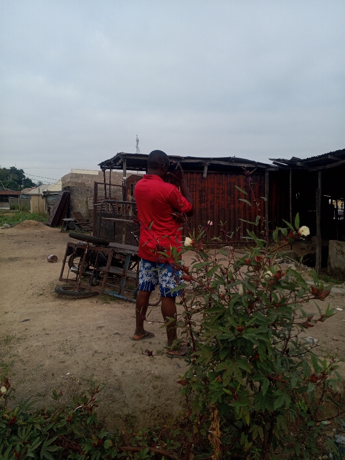An outdoor, daytime scene in Adankolo, Nigeria, under an overcast sky depicts a single adult male, viewed from the back