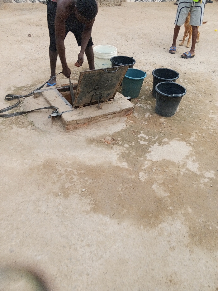 A person wearing shorts and flip-flops is opening a ground-level metal hatch using a metal bar. Around the hatch are several buckets, some black, and one each white and blue. The surrounding ground is dirt with wet spots. Another person in shorts and flip-flops stands nearby with a brown dog. The scene appears to be outdoors in a rural or developing area.