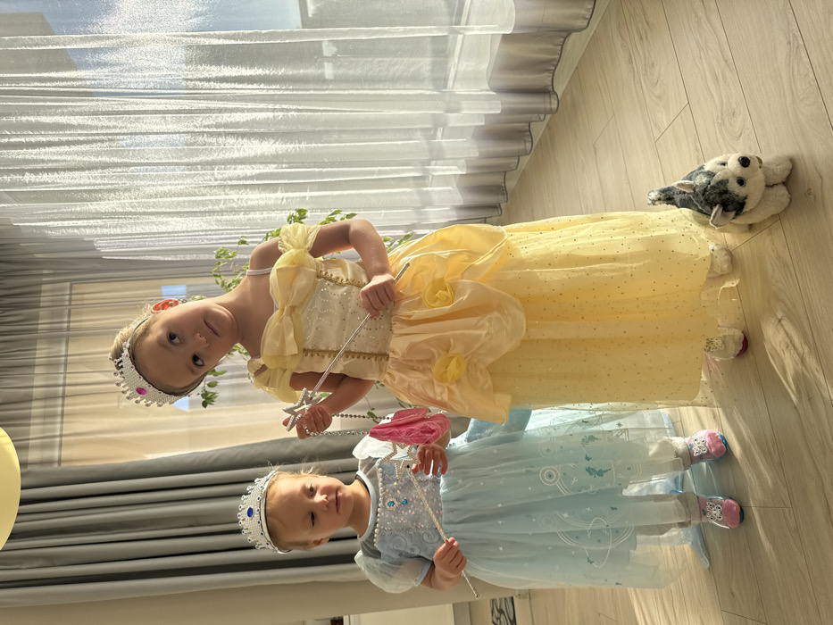An indoor, eye-level photograph shows two young Caucasian females dressed in princess costumes standing on a light-colored wooden floor