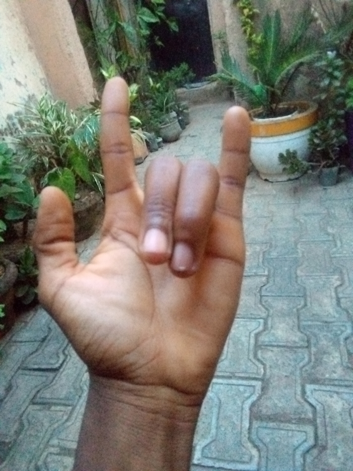 - "The image displays a dark-skinned human left hand making a "rock on" gesture, with the index finger and pinky extended, and the middle and ring fingers curled into the palm, while the thumb is also extended" by FM-o8KGQ2, licensed under CC BY 4.0