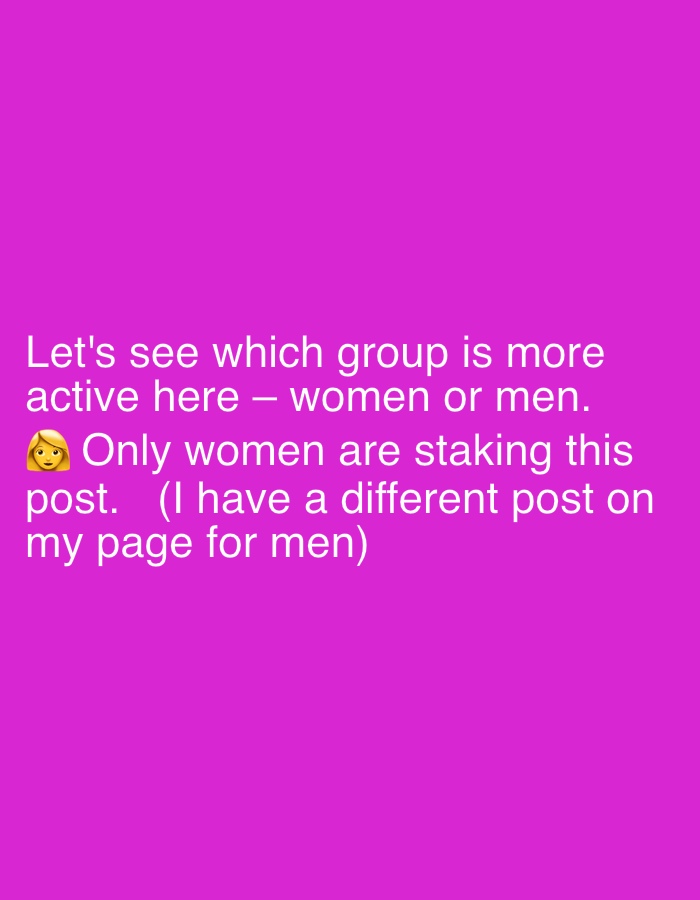 The image is a social media post displayed in white text on a purple background. The post reads: "Let's see which group is more active here - women or men. 👩 Only women are staking this post. (I have a different post on my page for men)". The woman emoji is located before the statement: "Only women are staking this post". There are no signs indicating this image was taken in Ungasan, Indonesia.