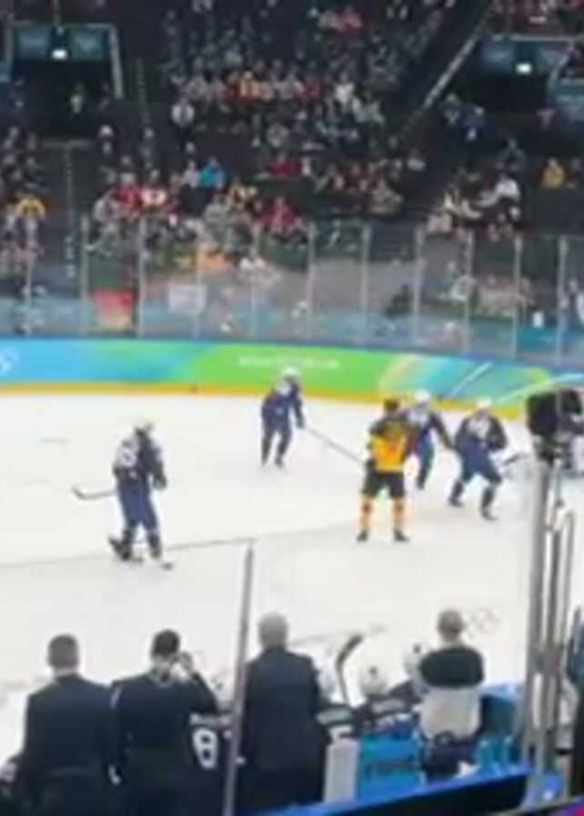 hockey game between teams wearing navy blue and yellow jerseys, respectively. Several players are near the net, with the yellow team on offense. One player in navy blue knocks down a player in yellow near the net. Other players from both teams are moving on the ice. The stands are full of spectators. A sign in the background shows the Olympic rings and the words “MILANO CORTINA 2026.”