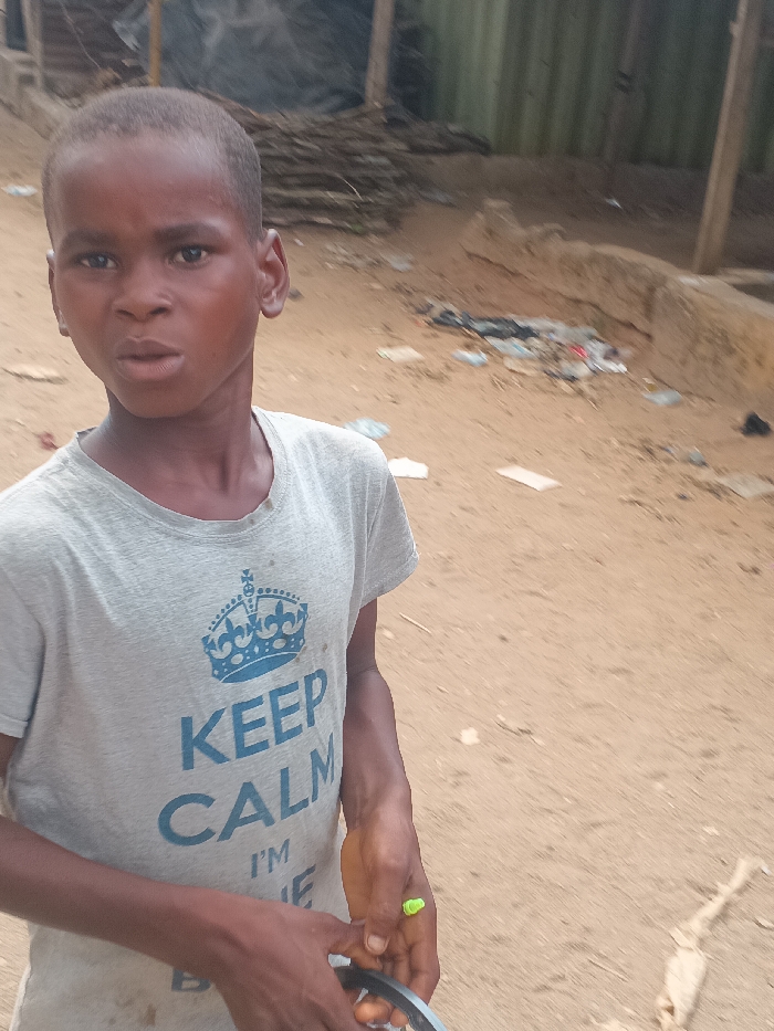 A young, slender, dark-skinned boy wearing a gray t-shirt with a blue "Keep Calm" crown and text stands outside. He is holding a dark object. The background includes sandy soil, scattered trash, wooden planks, and a corrugated metal structure. His expression appears serious, almost questioning. The lighting is diffused and overcast.
